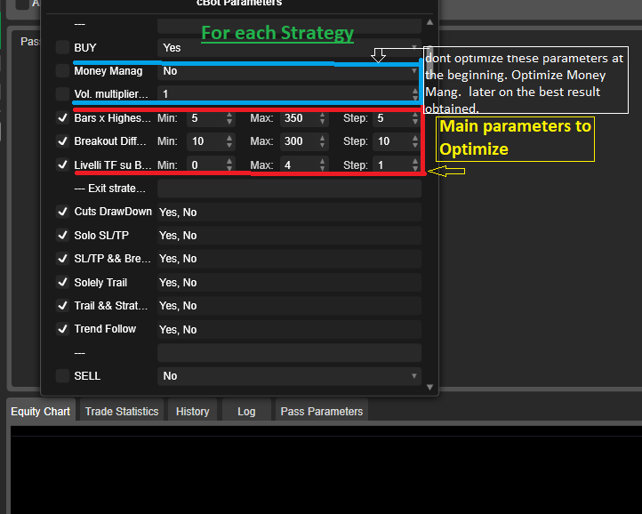 The optimization process, must be done for each strategy excluding the others and separately on a single strategy first Buy and then Sell), on a normal computer, it can take longer (consider that you are working on 5 TimeFrame) but in the end it is worth as you will get very satisfying results and succeeding also to understand where the symbol moves better on Buy (long) or Sell (short) in Breakout or in Reverse. When the optimization of a strategy ends, set aside the best parameters. When has been done for all strategies, manually enter the parameters of each strategy in the bot.